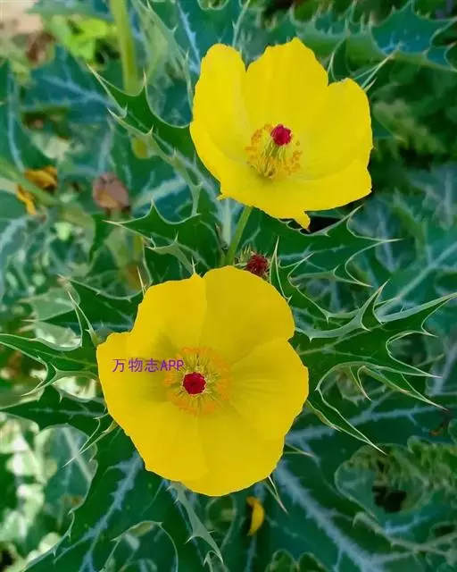 一年生草本(栽培者常为多年生、灌木状),通常粗壮,高30-100厘米。茎具分枝和多短枝,疏被黄揭色平展的刺。基生叶密聚,叶片宽倒披针形、倒卵形或椭圆形,长5-20厘米,宽2.5-7.5厘米,先端急尖,基部楔形,边缘羽状深裂,裂片具波状齿,齿端具尖刺,两面无毛,沿脉散生尖刺,表面绿色,沿脉两侧灰白色,背面灰绿色;叶柄长0.5-1厘米;茎生叶互生,与基生叶同形,但上部叶较小,无柄,常半抱茎。花单生于短枝顶,有时似少花的聚伞花序;花梗极短。花芽卵形,长约1.5厘米;萼片2,舟状,长约1厘米,先端具距,距尖成刺,外面无毛或散生刺,花开时即脱落;花瓣6,宽倒卵形,长1.7-3厘米,先端圆,基部宽楔形,黄色或橙黄色;花丝长约7毫米,花药狭长圆形,长1.5-2毫米,开裂后弯成半圆形至圆形;子房椭圆形或长圆形,长0.7-1厘米,被黄褐色伸展的刺,花柱极短,柱头4-6裂,深红色。蒴果长圆形或宽椭圆形,长2.5-5厘米,宽1.5-3厘米,疏被黄褐色的刺,4-6瓣自顶端开裂至全长的1/4-1/3。种子球形,直径1.5-2毫米,具明显的网纹。花果期3-10月。