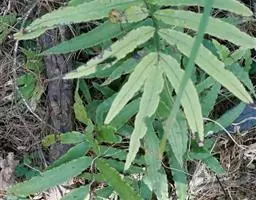 植株高30-50厘米。根状茎细长,斜升或横卧,粗4-5毫米,被黑褐色鳞片。叶密生,二型;柄长10-30厘米(不育叶的柄较短),粗1.5-2毫米,与叶轴同为禾秆色,稍光泽,光滑;叶片长圆状卵形,长10-25厘米(不育叶远比能育叶短),宽5-15厘米羽状,羽片中央沿主脉两侧各有1条纵行的灰白色带。羽片3-6对,对生,稍斜向上,上部的无柄,下部的有短柄;不育叶的下部羽片相距1.5-2(3)厘米,三角形,尖头,长2.5-3.5(8)厘米,宽1.5-2.5(4)厘米,常为羽状,小羽片2-3对,对生,密接,无柄,斜展,长圆状倒卵形至阔披针形,先端钝圆,基部下侧下延下部全缘,上部及先端有尖齿;能育叶的羽片疏离(下部的相距5-7厘米),通常为2-3叉,中央的分叉最长,顶生羽片基部不下延,下部两对羽片有时为羽状,小羽片2-3对,向上,狭线形,先端渐尖,基部下侧下延,先端不育的叶缘有密尖齿,余均全缘主脉禾秆色,下面隆起;侧脉密接,通常分叉。叶干后草质,灰绿色至褐绿色,无毛。