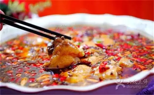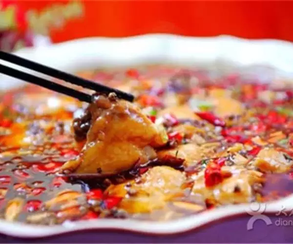 5. 红油入锅烧至七八成热,倒入一不锈钢盆中,随浆好鱼片及味碟上桌。