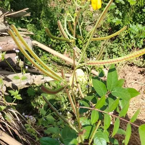 花数朵组成伞房状总状花序,腋生和顶生,长约5厘米;苞片线状披针形或长卵形,长渐尖,早脱;花长约2厘米;萼片不等大,外生的近圆形,长6毫米,内生的卵形,长8-9毫米;花瓣黄色,外生的卵形,长约15毫米,宽9-10毫米,其余可长达20毫米,宽15毫米,顶端圆形,均有短狭的瓣柄;雄蕊7枚发育,3枚不育,无花药。荚果带状镰形,褐色,压扁,长10-13厘米,宽8-9毫来,稍弯曲,边较淡色,加厚,有尖头;果柄长1-1.5厘米;种子30-40颗,种子间有薄隔膜。