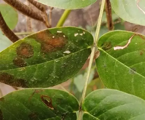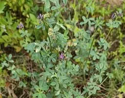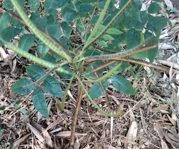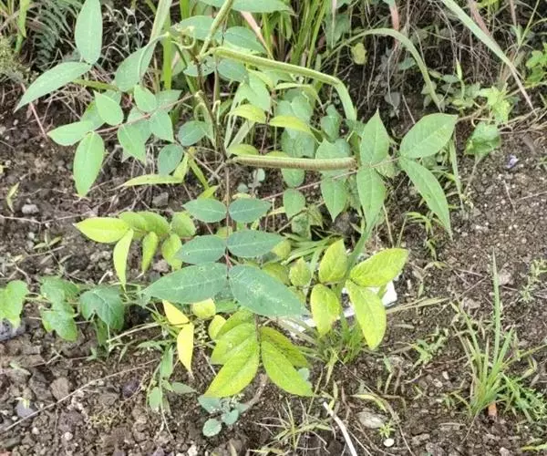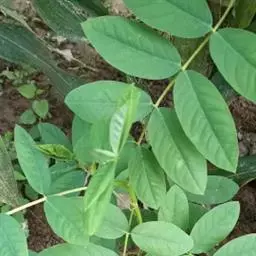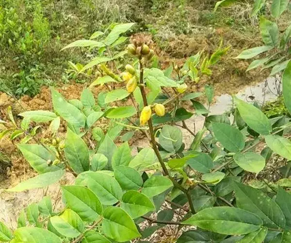 直立、少分枝的亚灌木或灌木,无毛,高0.8-1.5米;枝带草质,有棱;根黑色。叶长约20厘米;叶柄近基部有大而带褐色、圆锥形的腺体1枚;小叶4-5对,膜质,卵形至卵状披针形,长4-9厘米,宽2-3.5厘米,顶端渐尖,有小缘毛;小叶柄长1-1.5毫米,揉之有腐败气味;托叶膜质,卵状披针形,早落。