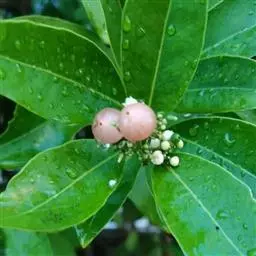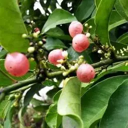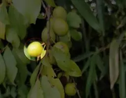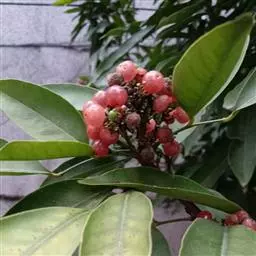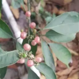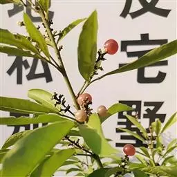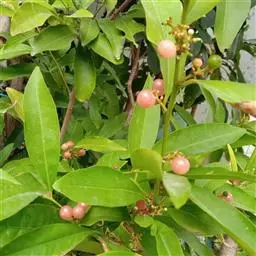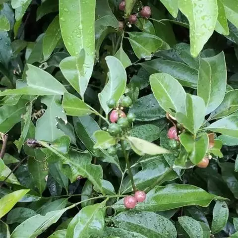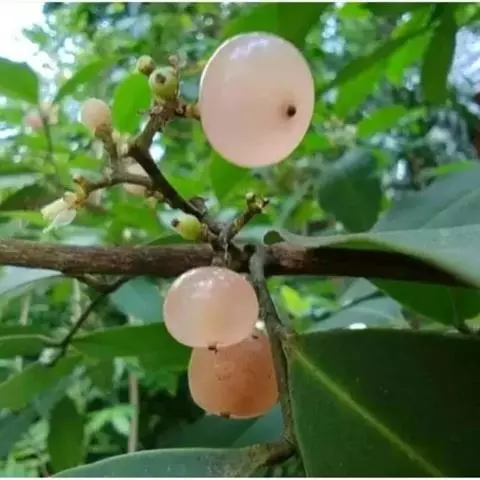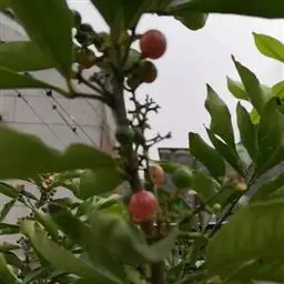果圆球形或椭圆形,径10—15毫米,淡黄白色转淡红色或暗朱红色,半透明,油点明显,有种子3—2、稀1粒、花期3一5月,果期7—9月。通常除冬、春初季节外常在同一树上有成熟果也同时开花。 [1-2]