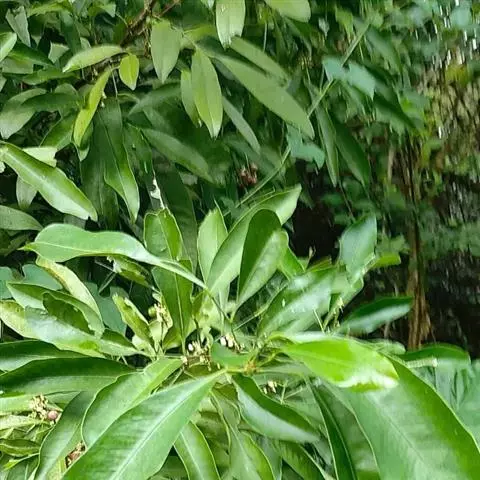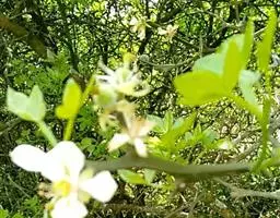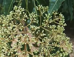 圆锥花序腋生及顶生,通常3—5厘米,很少较短,但顶生的长可达14厘米;花序轴、花梗及萼片常被早脱落的褐锈色微柔毛;萼裂片卵形,端钝,宽约1毫米;花瓣白色,长约4毫米,长椭圆形,较迟脱落,干后变淡褐色,边缘淡黄色;雄蕊10枚,极少8枚,花丝略不等长,上部宽阔,下部稍狭窄,与花药接连处突尖,药隔顶端有1油点;子房阔卵形至圆球形,油点不凸起,花柱极短,柱头稍增粗,子房柄略升起。