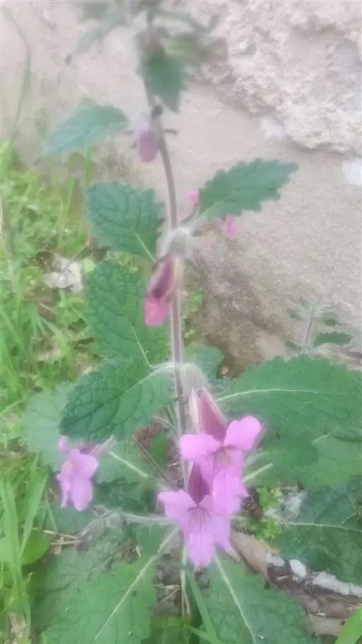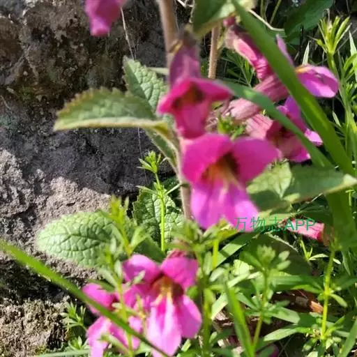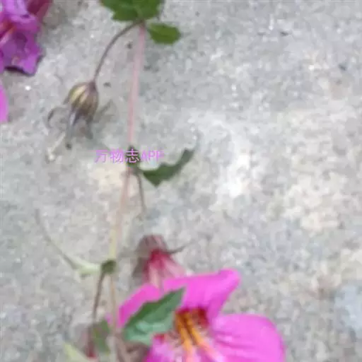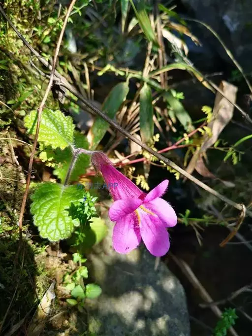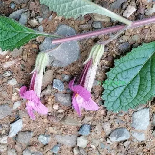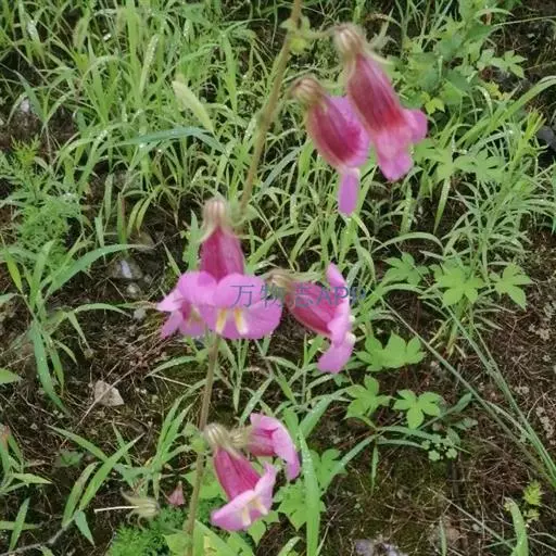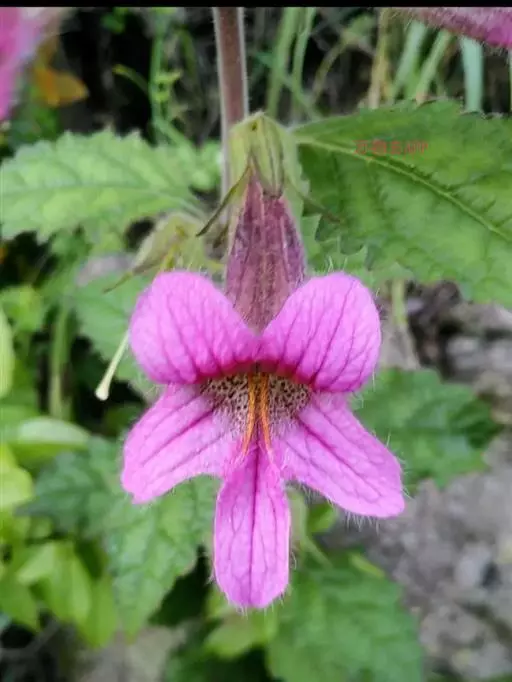 花单生,连同花梗总长超过苞片;花梗长1-4厘米,多少弯曲而后上升,与萼同被多细胞长柔毛及腺毛;萼长1-2厘米;萼齿披针形或卵状披针形,先端略尖;后方3枚稍长,中间的1枚长1-1.2厘米,两侧的长0.5-0.8厘米;前方2枚长0.3-0.7厘米,彼此近于相等;花冠紫红色,长5.5-7厘米,外面被多细胞长柔毛;上唇裂片长卵形,先端略尖或钝圆,长1.4-1.8厘米;下唇裂片长椭圆形,先端尖或钝圆,中裂片长约2厘米,宽1.4厘米,侧裂片稍小;雄蕊后方一对稍短,其花丝基部被短腺毛,前方一对稍长,其花丝无毛;药室矩圆形,长约1.5毫米,基部叉开成一直线;花柱顶端扩大,先端尖或钝圆。蒴果卵形,长约1.4厘米,具宿存的花萼及花柱。种子多数,卵形至长卵形,长约1.1毫米,具网眼。花期4-5月,果期5-6月。