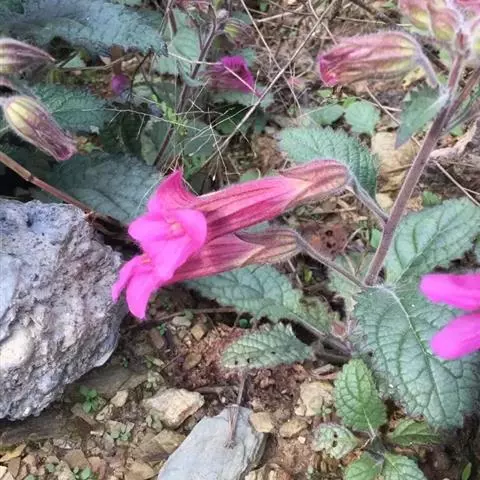 天目地黄(学名:Rehmannia chingii Li)是玄参科地黄属,多年生半常绿草本。根茎肉质肥厚,橘红色。茎直立,株高30-60厘米,全株被灰白长柔毛或腺毛。基生叶莲座状,叶椭圆形,基部渐狭成长柄;茎生叶向上渐小,上面绿色,皱缩;下面紫红色;叶缘锯齿。总状花序顶生或单生叶腋;花大,花冠筒微弯,外面紫红色,内面黄色油紫斑。蒴果卵形,种子多。花期4-5月。