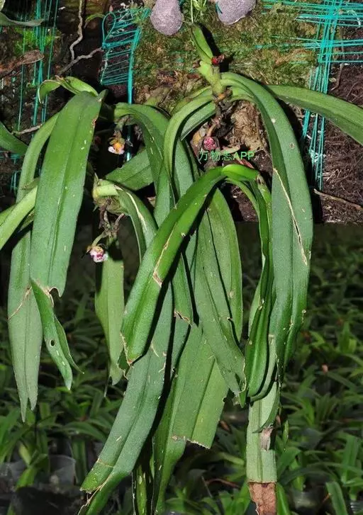 大花盆距兰茎粗壮,长2-5厘米,节间长约1厘米。叶大,带状或长圆形,长11.5-23.5厘米,宽1.5-2.3厘米,先端不等侧2裂,裂片先端稍尖。