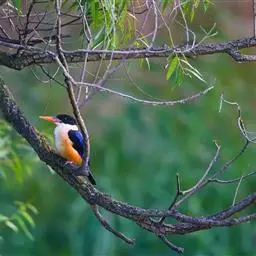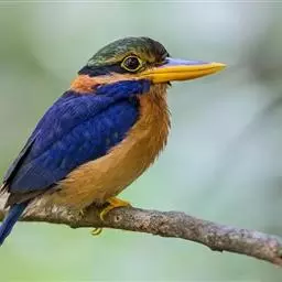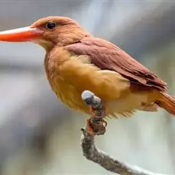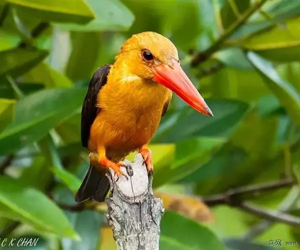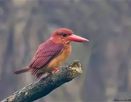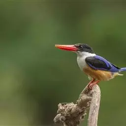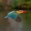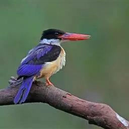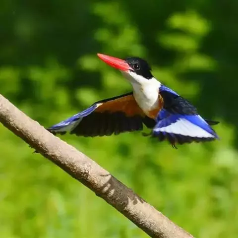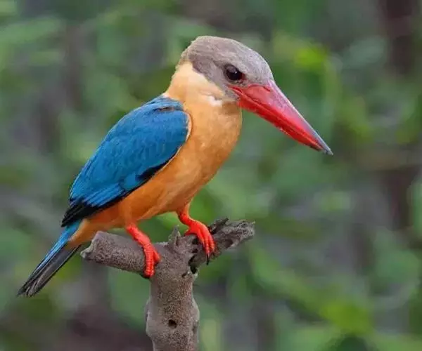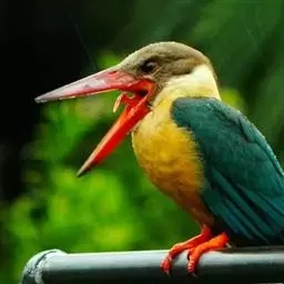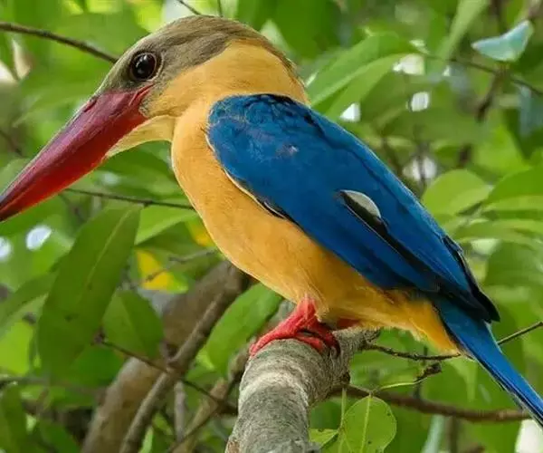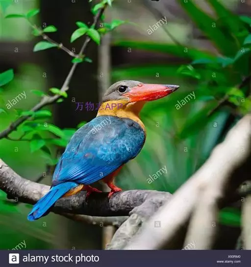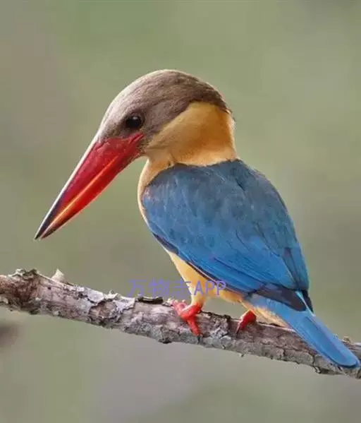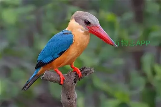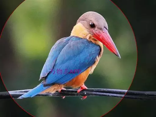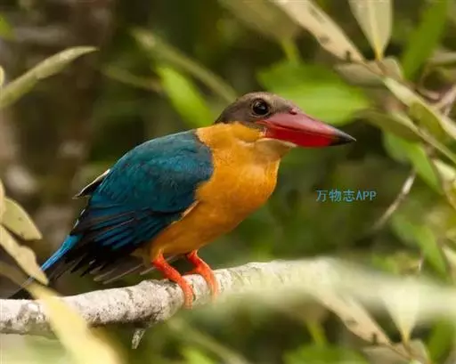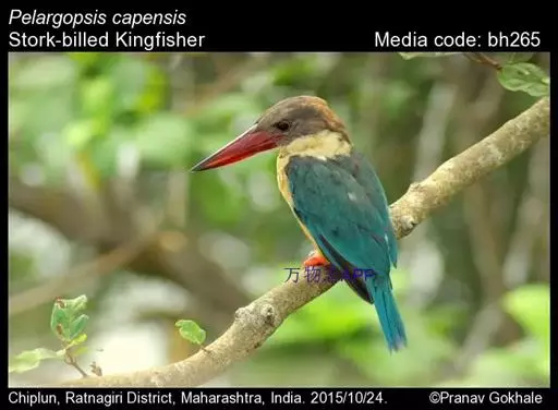 鹳嘴翡翠(学名:Pelargopsis capensis):体长33-37厘米。体重140-200克。共有13个亚种,体型大,嘴形巨大、侧扁,似鹳嘴,红色,嘴峰两侧有鼻沟。头灰褐色,上体蓝色,下体和宽阔的领环赭土色,脚红色。飞翔时翅上无斑。