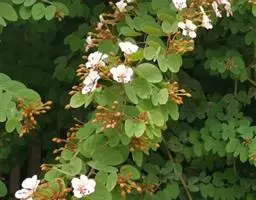 总状花序狭长,腋生,有时与叶对生或数个聚生于枝顶而成复总状花序,长7-20厘米,被灰褐色小柔毛;苞片与小苞片小,锥尖;花蕾椭圆形,长2.5-3毫米,具凸头,与萼及花梗同被灰褐色短柔毛;花直径约8毫米;花梗纤细,长10-15毫米;花托漏斗形,长约2毫米;萼片披针形,长约3毫米;花瓣白色,具瓣柄,瓣片匙形,长约4毫米,外面中部疏被丝毛;能育雄蕊3,花丝长约6毫米,无毛;退化雄蕊2;子房具短柄,仅沿两缝线被毛,花柱短,柱头小。荚果倒卵状长圆形或带状,扁平,长7-12厘米,宽2.5-3厘米,无毛,果瓣革质;种子2-5颗,圆形,扁平,直径约12毫米。花期6-10月;果期7-12月。