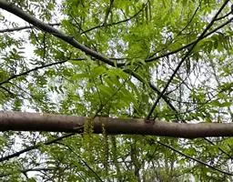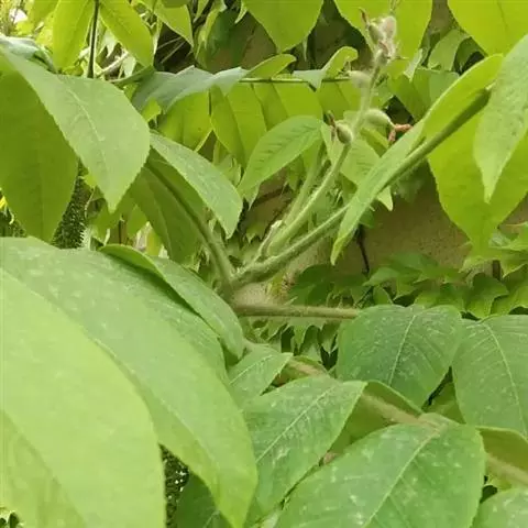 奇数羽状复叶生于萌发条上者长可达80厘米,叶柄长9-14厘米,小叶15-23枚,长6-17厘米,宽2-7厘米;生于孕性枝上者集生于枝端,长达40-50厘米,叶柄长5-9厘米,基部膨大,叶柄及叶轴被有短柔毛或星芒状毛;小叶9-17枚,椭圆形至长椭圆形或卵状椭圆形至长椭圆状披针形,边缘具细锯齿,上面初被有稀疏短柔毛,后来除中脉外其余无毛,深绿色,下面色淡,被贴伏的短柔毛及星芒状毛;侧生小叶对生,无柄,先端渐尖,基部歪斜,截形至近于心脏形;顶生小叶基部楔形。