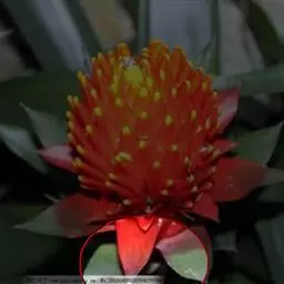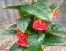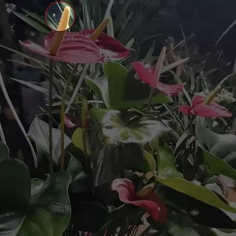 佛焰苞平出,卵心形,革质并有蜡质光泽,橙红色或猩红色;肉穗花序长5-7厘米,黄色,可常年开花不断。