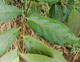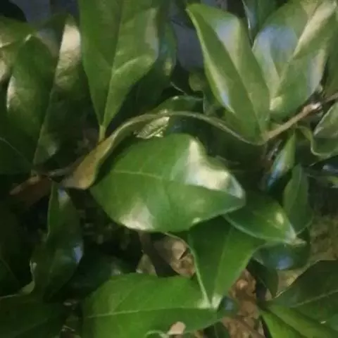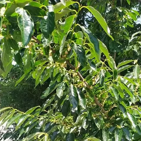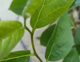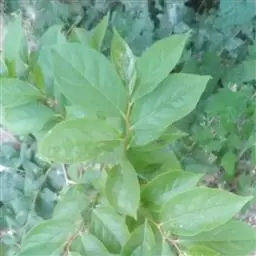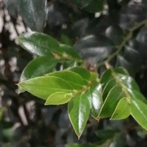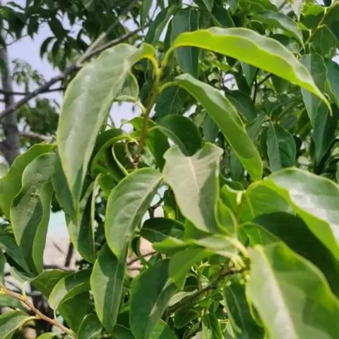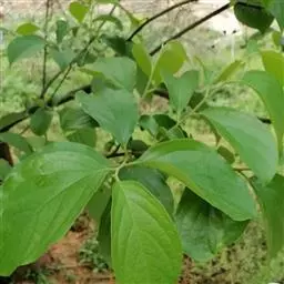 叶纸质,卵状椭圆形至倒卵形或近圆形,通常较大,长5-18厘米,宽2.8-9厘米,先端渐尖或钝,基部楔形,钝,圆形或近截形,很少为心形,新叶疏生柔毛,老叶上面有光泽,深绿色,无毛,下面绿色,有柔毛或无毛,中脉在上面凹下,有微柔毛,在下面凸起,侧脉每边5-7条,上面平坦或稍凹下,下面略凸起,下部的脉较长,上部的较短,向上斜生,稍弯,将近叶缘网结,小脉纤细,在上面平坦或微凹下,连结成小网状;叶柄长8-20毫米,变无毛,上面有浅槽。