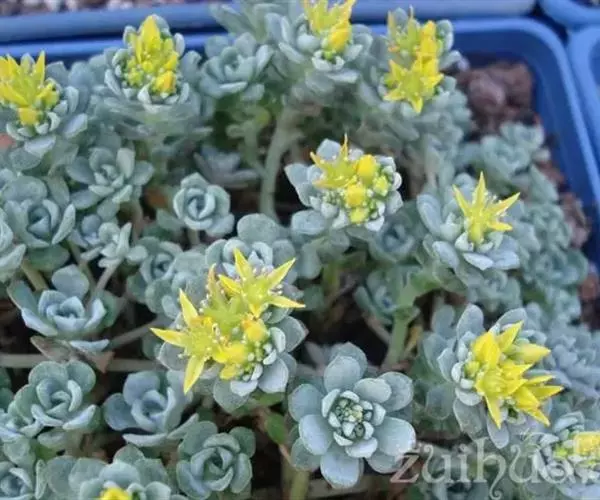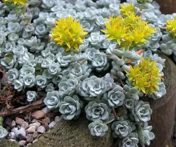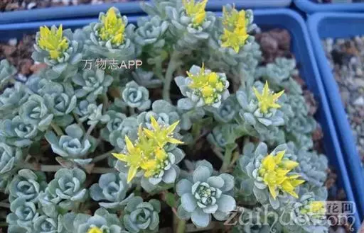 叶子绿色肉质会有白霜覆在表面,故名。易群生。 白霜Sedum spathulifolium ssp.