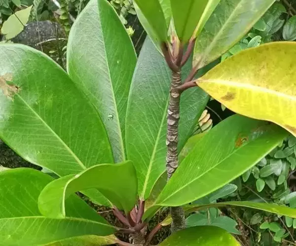 灌木或小乔木, 交让木 高3-10米;小枝粗壮,暗褐色,具圆形大叶痕。叶革质,长圆形至倒披针形,长14-25厘米,宽3-6.5厘米,先端渐尖,顶端具细尖头,基部楔形至阔楔形,叶面具光泽,干后叶面绿色,叶背淡绿色,无乳突体,有时略被白粉,侧脉纤细而密,12-18对,两面清晰;叶柄紫红色,粗壮,长3-6厘米。
