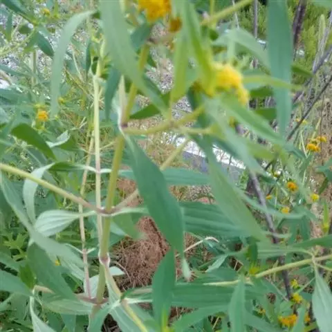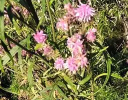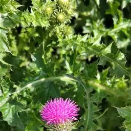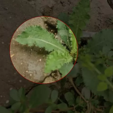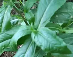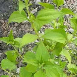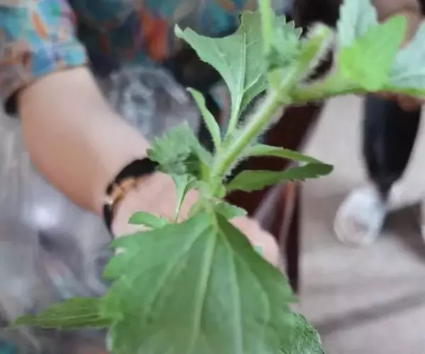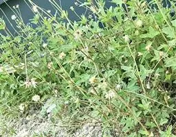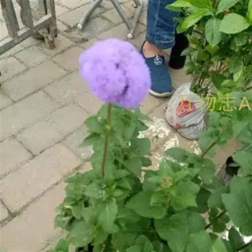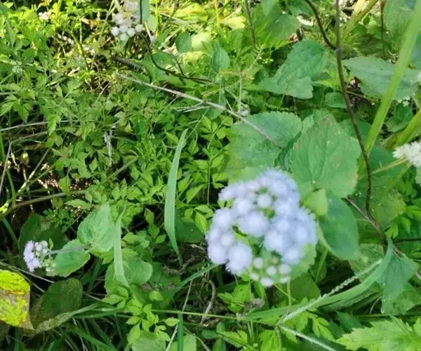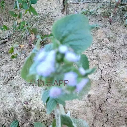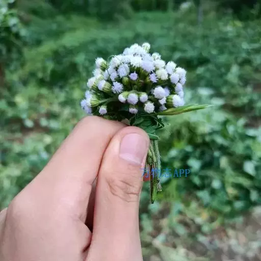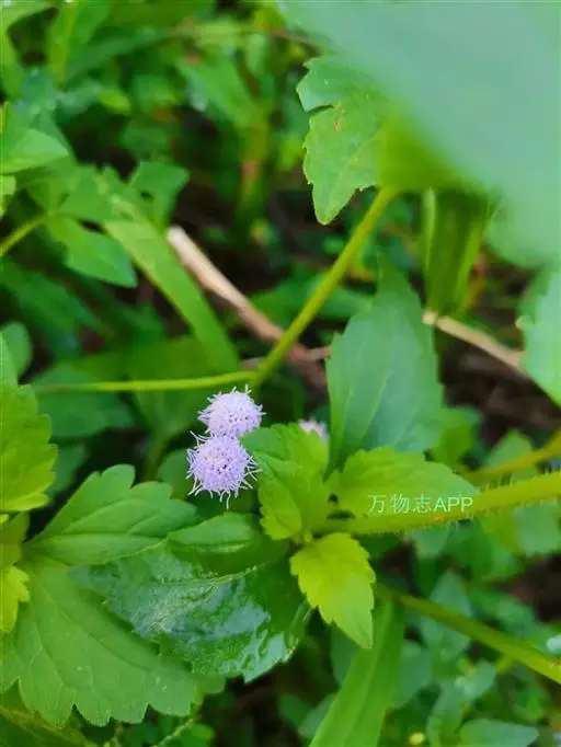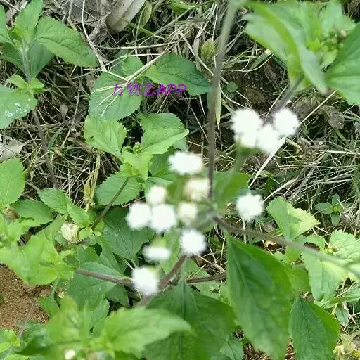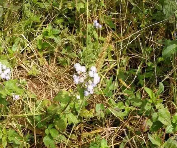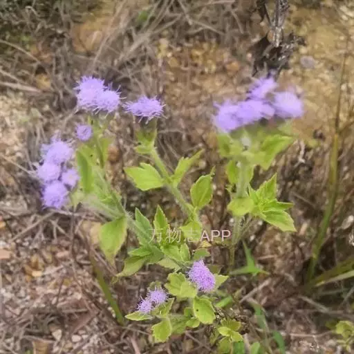 藿香蓟(学名:Ageratum conyzoides L.):一年生草本,高50-100厘米,有时又不足10厘米。无明显主根。茎粗壮,基部径4毫米,不分枝或自基部或自中部以上分枝。全部茎枝淡红色,或上部绿色,被白色尘状短柔毛或上部被稠密开展的长绒毛。叶对生,有时上部互生,卵形或长圆形,有时植株全部叶小形,基出三脉或不明显五出脉。头状花序4-18个在茎顶排成通常紧密的伞房状花序,总苞钟状或半球形,宽5毫米。总苞片2层,长圆形或披针状长圆形。花冠长1.5-2.5毫米,外面无毛或顶端有尘状微柔毛,檐部5裂,淡紫色。瘦果黑褐色,5棱。花果期全年。