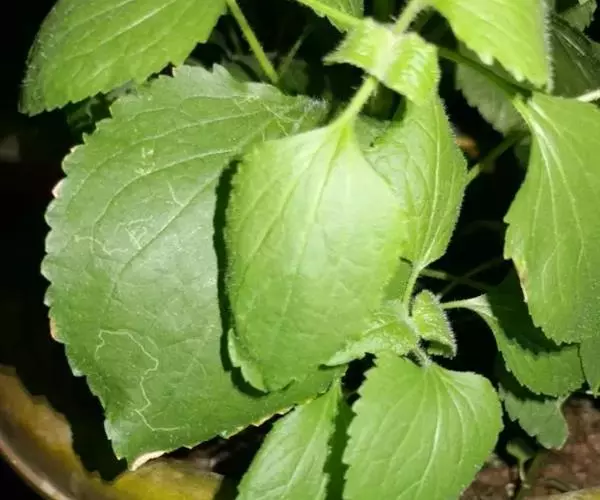 叶对生,有时上部互生,常有腋生的不发育的叶芽。中部茎叶卵形或椭圆形或长圆形,长3-8厘米,宽2-5厘米;自中部叶向上向下及腋生小枝上的叶渐小或小,卵形或长圆形,有时植株全部叶小形,长仅1厘米,宽仅达0.6毫米。全部叶基部钝或宽楔形,基出三脉或不明显五出脉,顶端急尖,边缘圆锯齿,有长1-3厘米的叶柄,两面被白色稀疏的短柔毛且有黄色腺点,上面沿脉处及叶下面的毛稍多有时下面近无毛,上部叶的叶柄或腋生幼枝及腋生枝上的小叶的叶柄通常被白色稠密开展的长柔毛。