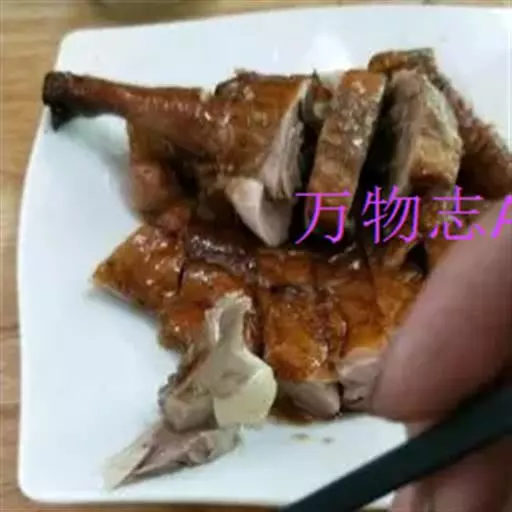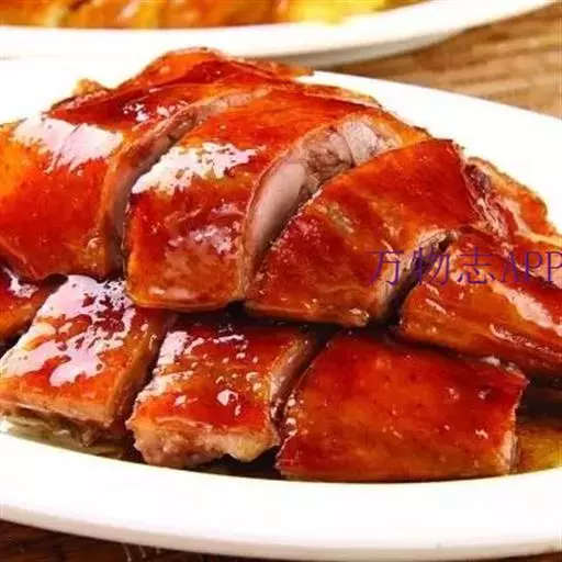 6、将晾干的鹅挂入烤炉中,用果木木炭烧中火慢烤,烤至鹅肉熟透时,改用大火将鹅的表皮烤至酥脆,取出,先倒出鹅腹内的卤汁,将鹅斩件装盘,再淋上卤汁,随酸梅酱味碟上桌蘸食即可。