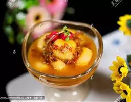 2、用姜末10克、蒜茸10克、葱末20克、精盐15克、白糖20克、料酒30克、生抽10克、芝麻酱10克、鸡精10克、五香粉5克、陈皮粉2克加适量二汤调匀,制成味汁;另将麦芽糖、白醋、大红浙醋、曲酒按1:13:1:1调匀,制成脆皮水(可保存好,多次使用)。