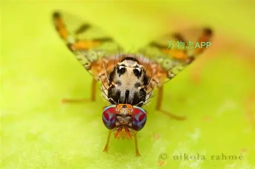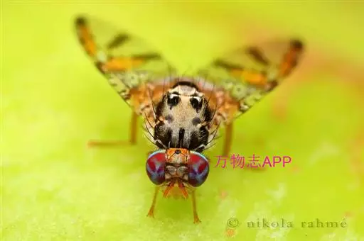成虫:体长4.5~5.5mm,翅长4.5毫米,体和翅上有特殊颜色,头褐色,额黄色。雄虫具有奇异的银灰色匙形额附器。胸部背面黑色有光泽,镶以黄白色斑纹。翅透明,短而宽,有黄色、褐色和黑色的斑点,并有断续的带纹;中部的带纹延伸到前缘和后缘;外侧的带纹仅延伸到翅的外缘而不及前缘,翅的前缘和基部为深灰色。雄虫前足腿节上侧的毛黑色,雌虫的为黄色。腹部橙红色,有2条红褐色带纹。雌虫产卵器较短而扁平,伸长时可达1.2毫米。卵白色到淡黄色,有光泽,纺锤形,略弯曲,两端尖。长0.9~1.1毫米,宽0.2~0.25毫米。