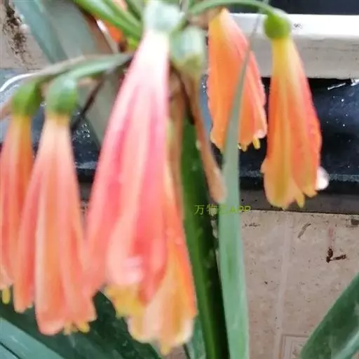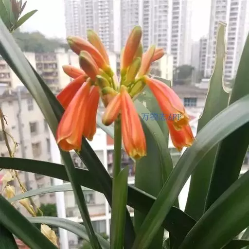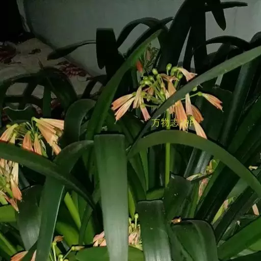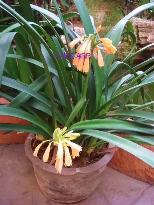 垂笑君子兰高雅肃穆,叶片狭长,花茎稍短叶于叶,花橙黄色,开放时下垂,呈桶状,是春节期间布置会场,点缀宾馆、美化家庭环境的盆栽花卉。