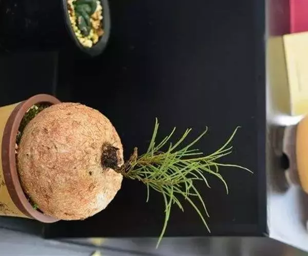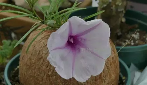 布鲁牵牛(Ipomea bolusiana),光滑的球形根,表面略有斑驳,稳稳地躺在土层表面。茎从球根的顶部伸出,叶片狭长。花着生于叶腋,漏斗形的花,更像是一个个小喇叭挂在了茎上。花粉色,与略带金黄色的球根相互映衬。圆锥形蒴果,果皮无毛且光滑,然而种子表面却有着褐色的毛。