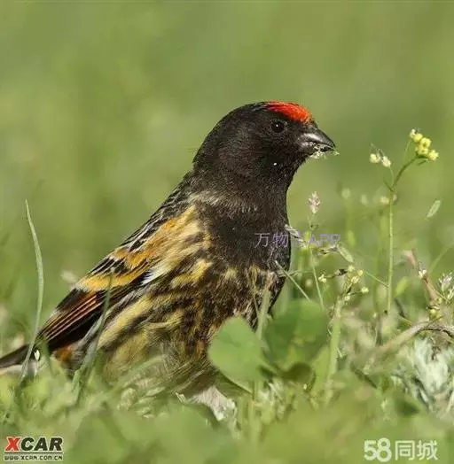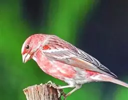 红腰朱雀:体长12-14厘米,小型鸟类。雄鸟前额和眉纹玫瑰粉红色,头顶和一宽的贯眼带深红褐色,背红…