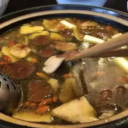 3.加热,用大火烧至开锅,用漏勺略去表面的渣滓;