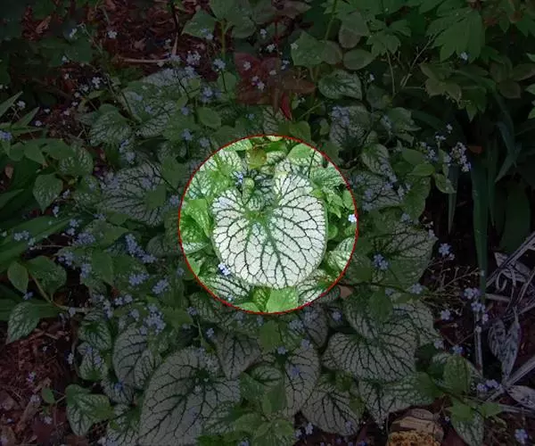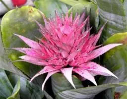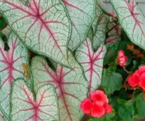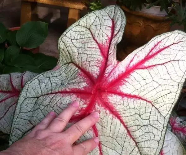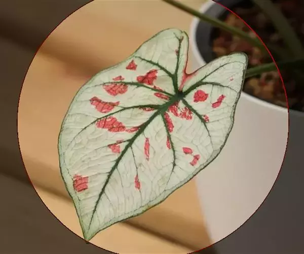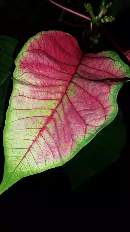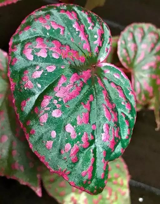 叶玫瑰红色,中心深紫红色,周围具白色斑纹,主脉红色。