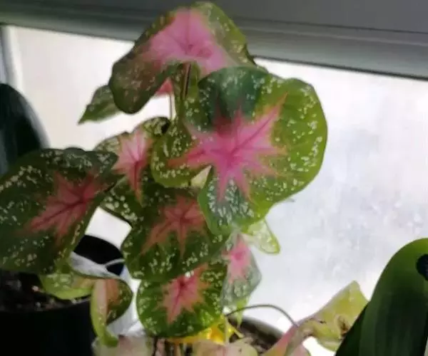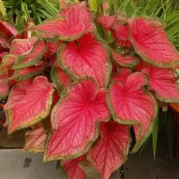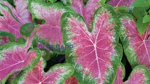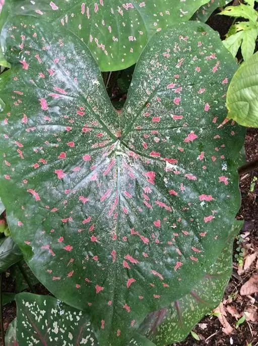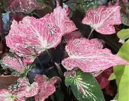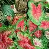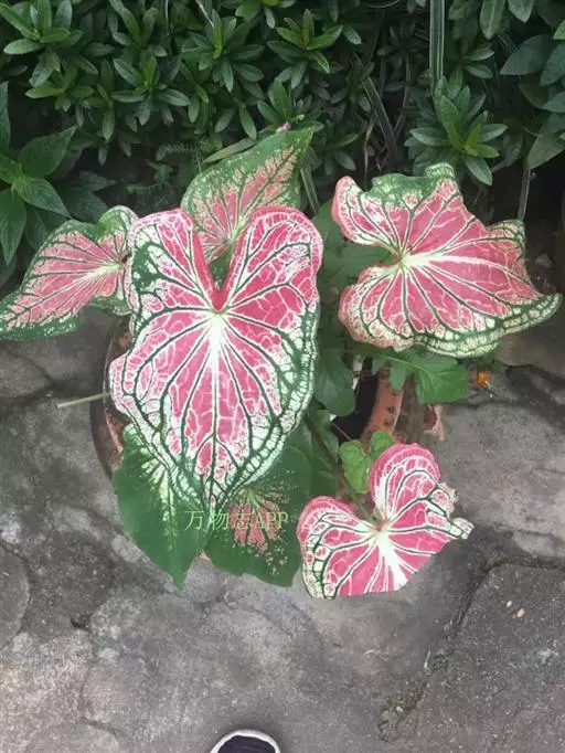 五彩芋(学名:Caladium bicolor (Ait.)Vent.)又名彩叶芋、两色芋,天南星科,五彩芋属多年生常绿草本植物。五彩芋的基生叶盾状箭形或心形,色泽美丽,变种极多;佛焰苞绿色,上部绿白色,呈壳状;肉穗花序。