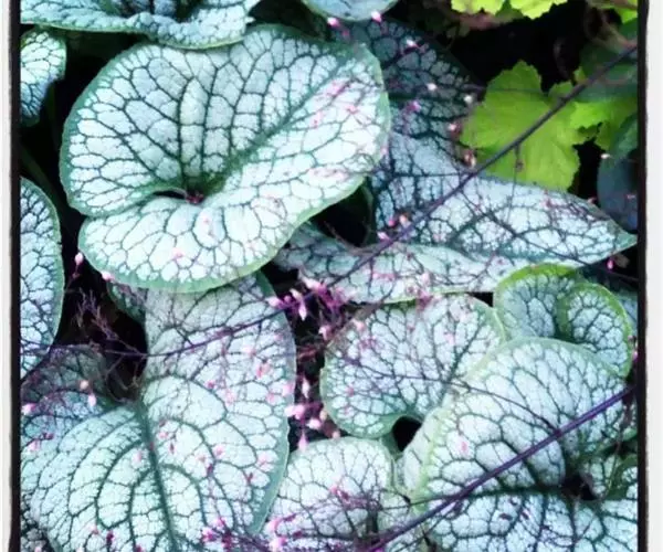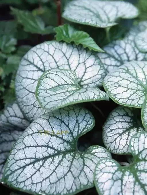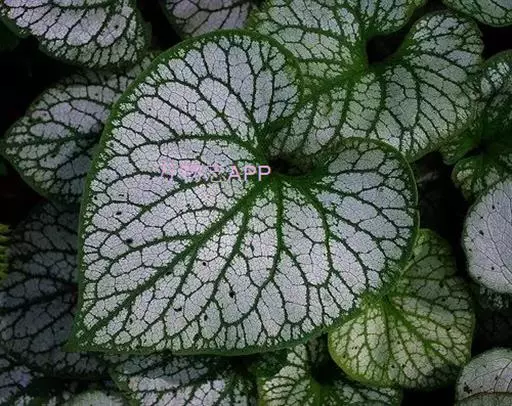 叶小,心脏形,叶脉白色,脉间具红色斑块,叶缘绿色。