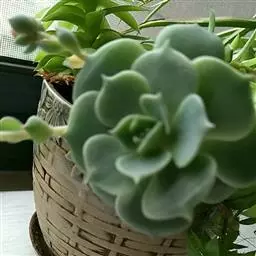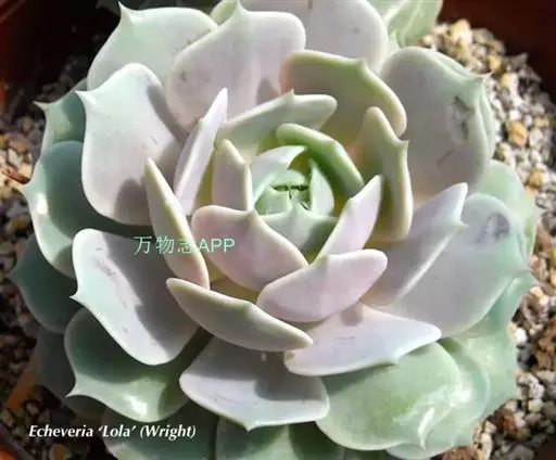 露娜莲(Echeveria 'Lola')是景天科拟石莲花属的多肉植物,由丽娜莲和静夜杂交而来。培育者为美国加利福尼亚州的育种师Dick Wright。灰绿色的叶片排列紧密,轮廓精致优雅,在阳光充足的环境下会呈现出优雅的藕荷色,颇似玉制的小玫瑰。是拟石莲花属中的代表品种之一。