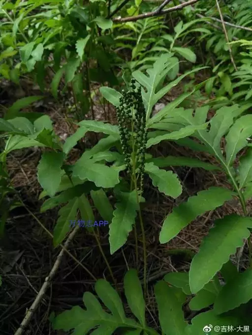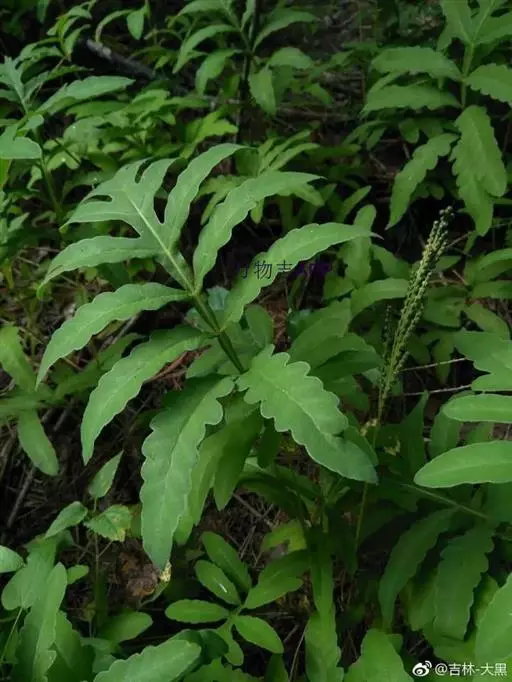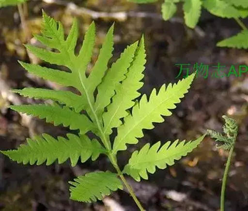 叶疏生,二形:不育叶柄长20-50厘米,基部棕褐色,略呈三角形,向上深禾秆色,圆柱形,粗2-3毫米,上面有浅纵沟,疏被棕色鳞片,叶片阔卵状三角形或阔卵形,长宽相等或长略过于宽,长13-30厘米,宽12-22厘米,先端羽状半裂,向下为一回羽状,羽片5-8对,相距1.5-3厘米,披针形,基部一对或下部1-2对较大,长8-12厘米,宽1.5-3厘米,有短柄,边缘波状浅裂,向上的无柄,基部与叶轴合生,边缘波状或近全缘,叶轴两侧具狭翅,叶脉明显,网状,网眼无内藏小脉,近叶边的小脉分离,叶草质,干后暗绿色或浅棕绿色,幼时略被小鳞片,成长后光滑无毛;能育叶低于不育叶,叶柄长18-45厘米,较不育叶柄粗壮,叶片强度狭缩,长15-25厘米,宽2-4厘米,二回羽状,羽片狭线形,与叶轴成锐角而极斜向上,小羽片紧缩成小球形,包被孢子囊群,彼此分离,排列于羽轴两侧,孢子囊群圆形,着生于由小脉先端形成的囊托上,囊群盖膜质,紧包着孢子囊群。染色体2n=74。