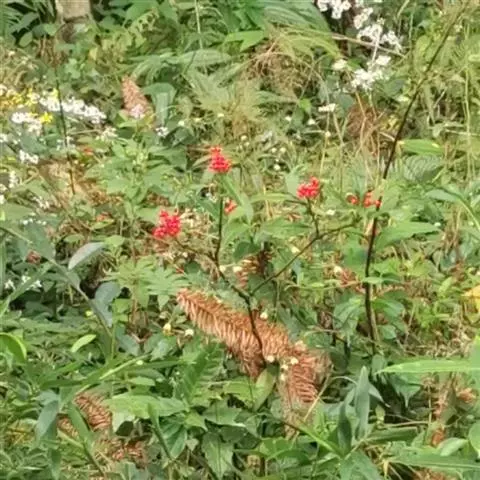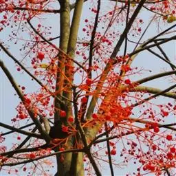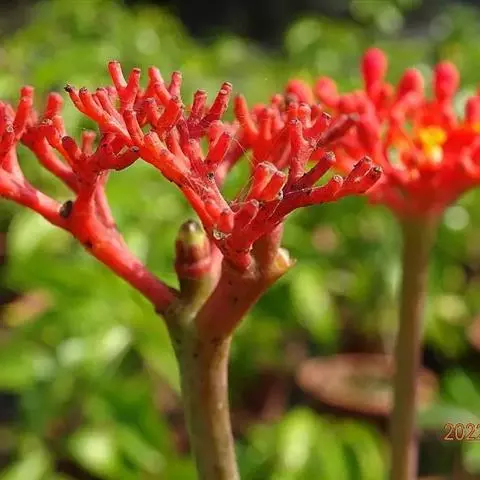 直立灌木,不分枝或少分枝,高0.3-1.5米,茎基部或下部通常膨大呈瓶状;枝条粗短, 北部湾广场瓶干树 肉质,具散生突起皮孔,叶痕大且明显。叶盾状着生,轮廓近圆形至阔椭圆形,长8-18厘米,宽6-16厘米,顶端圆钝,基部截形或钝圆,全缘或2-6浅裂,上面亮绿色,下面灰绿色,两面无毛;掌状脉6-8,其中上部3条直达叶缘;叶柄长8-16厘米,无毛;托叶分裂呈刺状,宿存。花序顶生,具长总梗,分枝短,红色,花萼长约2毫米,裂片近圆形,长约1毫米;花瓣倒卵状长圆形,长约6毫米,红色;雄花:雄蕊6-8枚,基部合生,花药与花丝近等长;雌花:子房无毛,花柱3枚,基部合生,顶端2裂。蒴果椭圆状,长13-18毫米,直径约15毫米,具3纵沟;种子长约1.1厘米,平滑。花期几全年。
