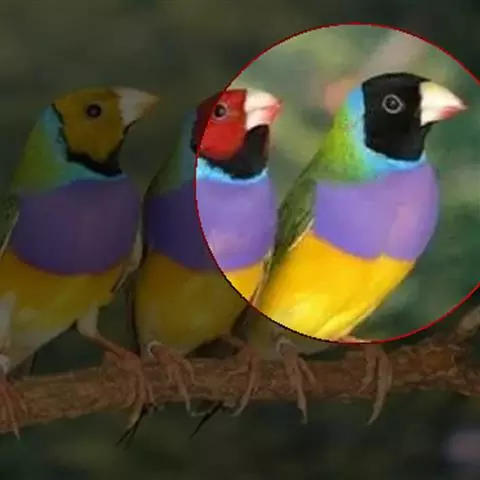 它们的雌雄可以从外观上分辨,母鸟的深栗 色区域界线很模糊 ,在脸部、下胸部及腹部的斑点是明亮的淡紫蓝色几乎 接近白色。幼鸟和成鸟的颜色相似,但是没有彩色斑块,嘴部是黑色的。在大约十周龄时,幼鸟会局部换毛。母鸟会变成接近白色,公鸟眼睛周围的羽毛会变成蓝紫色。一直到五个月大以後,它们会完全换羽成为成鸟的羽色。