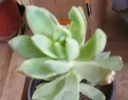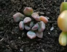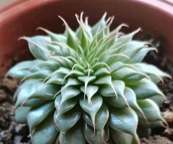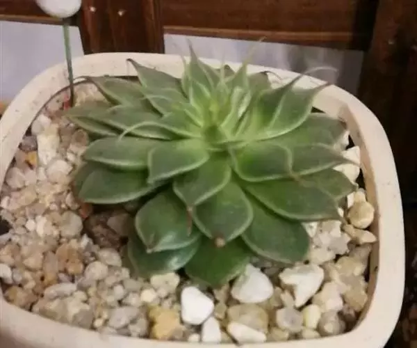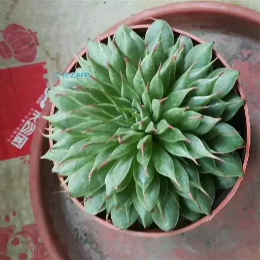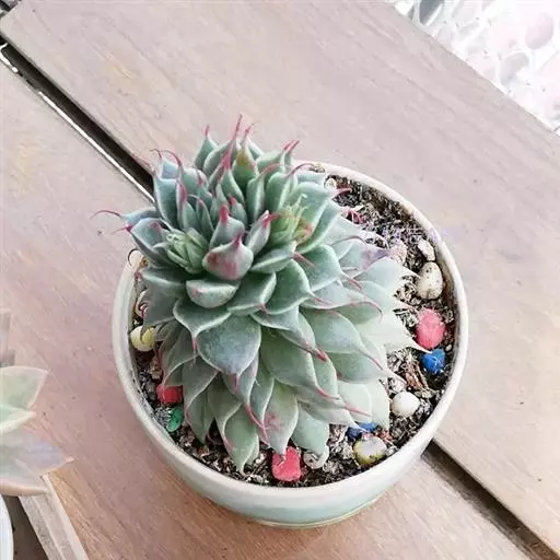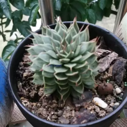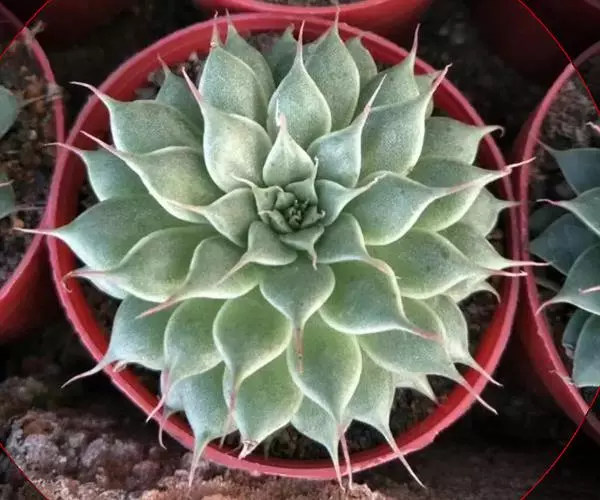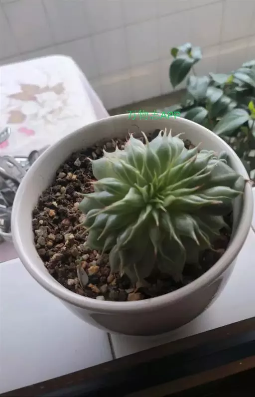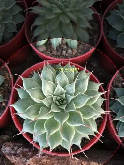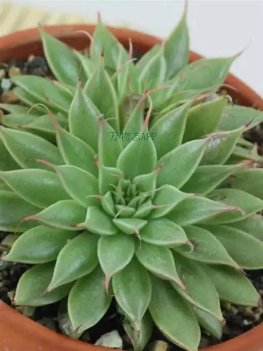 多年生肉质植物,莲座状叶盘较大,株幅可达10厘米。老株易丛生。叶长卵形 银星 ,较厚,叶面青绿色略带红褐色,有光泽,叶尖非常特殊,有1厘米长,褐色。