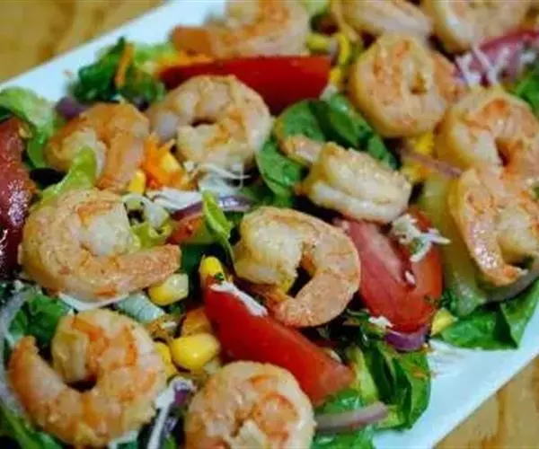 4、将各种色拉用蔬菜盛在盘子里,海鲜也盛好,样子要好看,然后用柠檬点缀,并淋上调味汁。