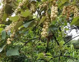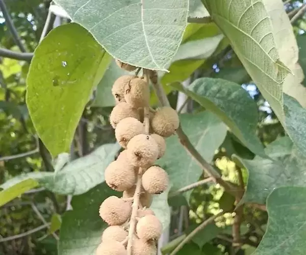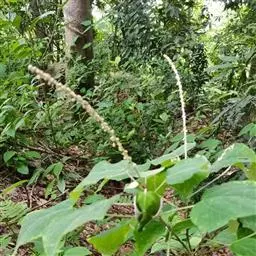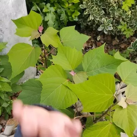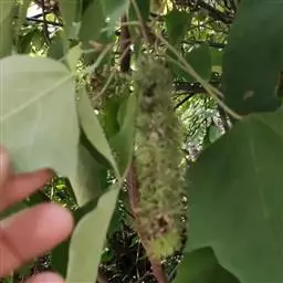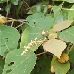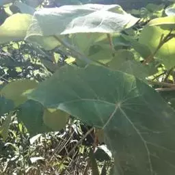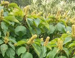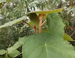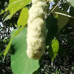 绒毛野桐,别名黄白尼泊尔野桐《云南种子植物名录》。小乔木。幼枝、叶柄及花序轴密被褐色绒毛。叶互生;叶柄长3-lOcm;叶片宽卵形或菱形,长l0-20cm,宽6-15cm,先端渐尖,基部钝圆形或宽楔形,不分裂或先端3浅裂,全缘,幼叶被毛并略显红色,老叶上面无毛,下面密被淡黄褐色星状柔毛,并散生黄色腺点。花单性异株,为顶生总状花序;雄花序通常分枝呈圆锥状,长8-20cm;雌花序不分枝,较雄花序稍粗短;雄花疏生,花萼3裂,雄蕊多数;雌花密生,子房3室,偶有2-4室,密被星状毛,花柱3,偶有2或4。蒴果球形,直径约lcm,密被星状毛并有软刺,散生黄色腺点;种子球形,黑色。花期6-8月,果期7-10月。