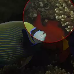 口小,吻突出。背鳍有强大鳍棘11根,以第四鳍棘为最长,臀鳍有强棘3根,背鳍鳍条部前下方有一镶白边圆形大蓝斑,体侧有4条镶蓝边黄色横带。