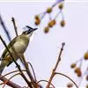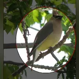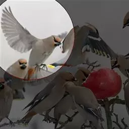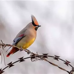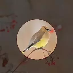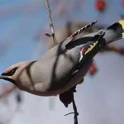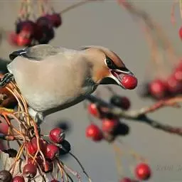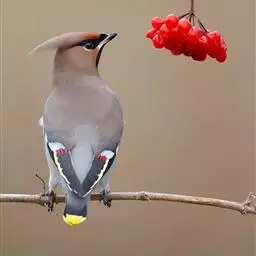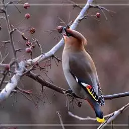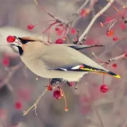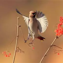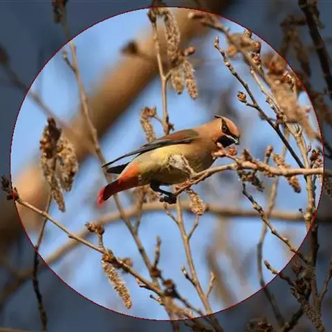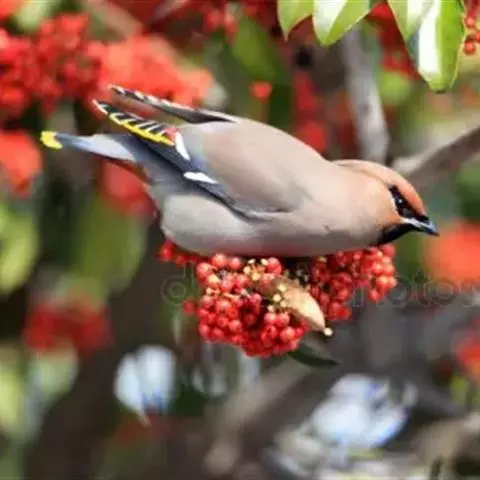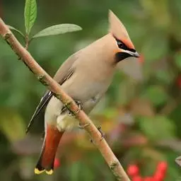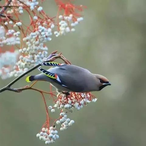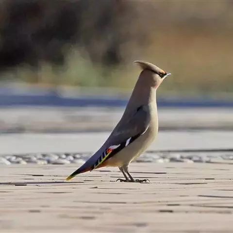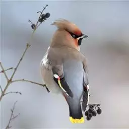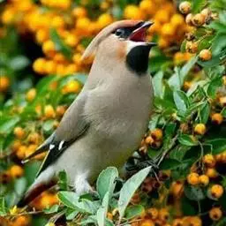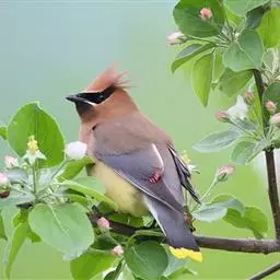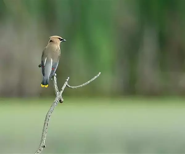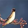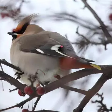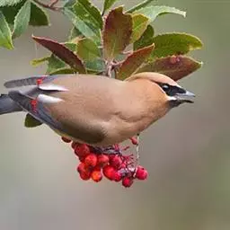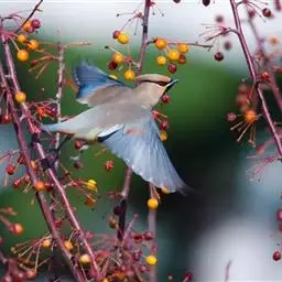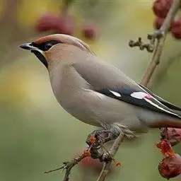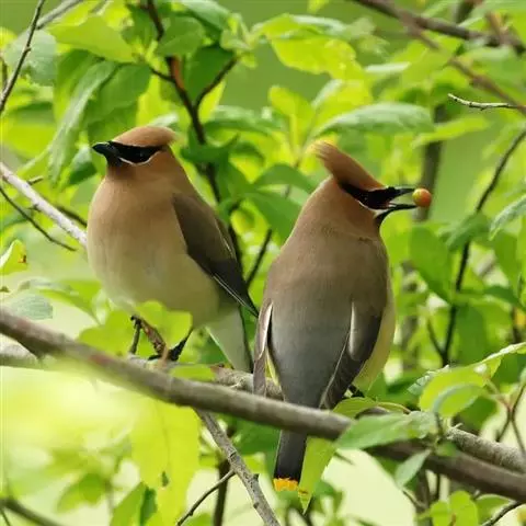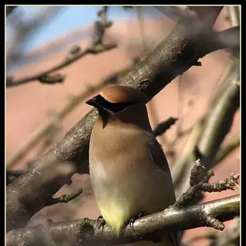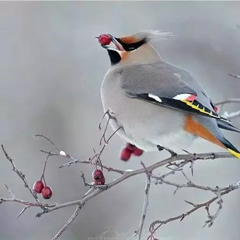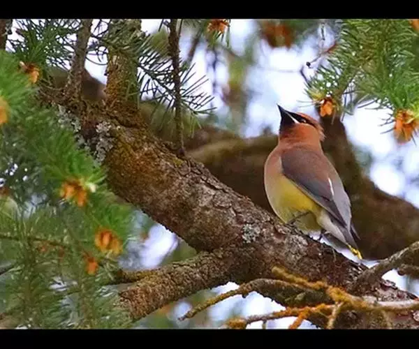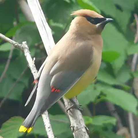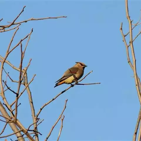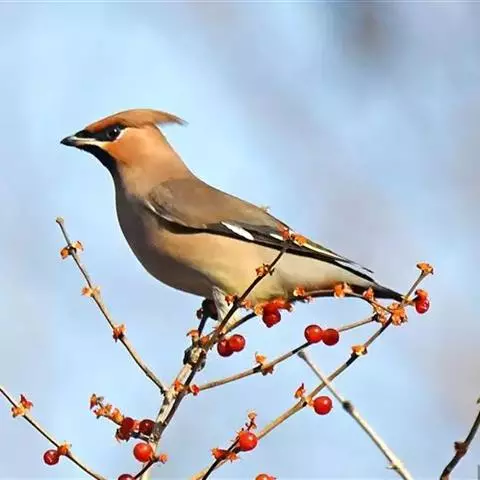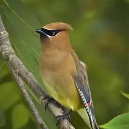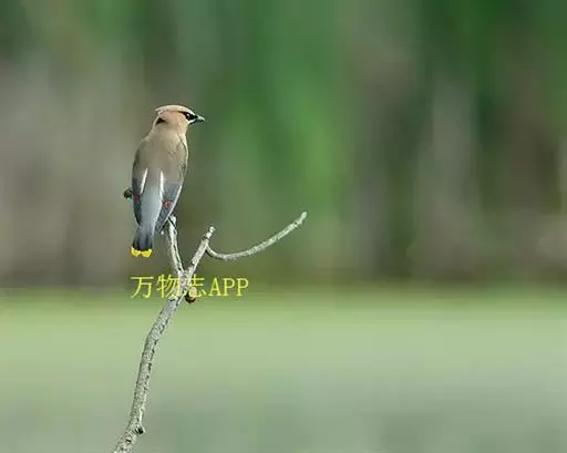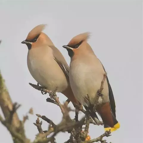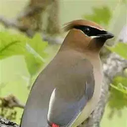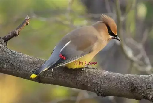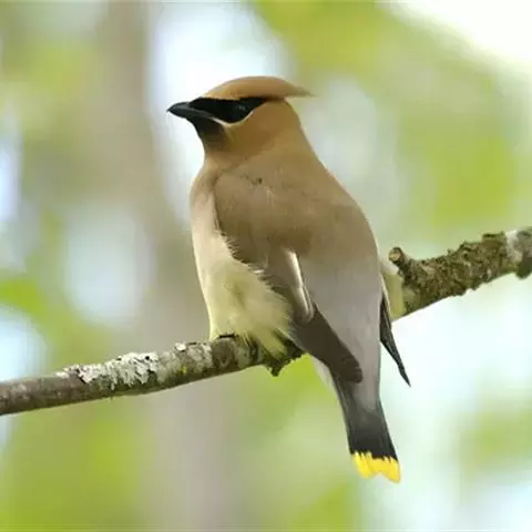 雪松太平鸟体形(学名Bombycilla cedrorum:)中等大小,体长约在19厘米左右。该物种雄雌同形同色,太平鸟成鸟额部及面部前端为栗色,向头后部颜色逐渐变浅;额基部、眼先、眼周及眼后部有黑色纹带,颌部亦有黑色区域;枕部黑色,与贯眼的黑色区域相链接,形成环绕头部的黑环;头顶具细长的簇状羽冠,这条羽冠常常覆盖在枕部的黑色羽区上,让人无法看到环绕头部的黑环;体羽松软,头部有一簇柔软的冠羽,嘴短,略呈钩状。喜群居,无领域性,多树栖,以松籽、浆果、昆虫为食。在美洲广泛分布。雪松太平鸟亚成鸟眼后和头枕部没有黑羽,前胸及腹部有明显的褐色带状纹。