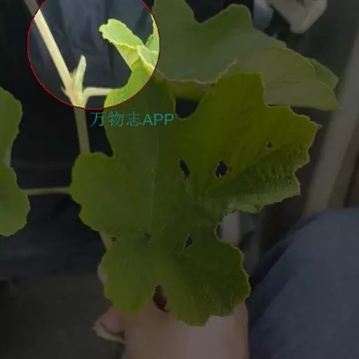 叶为纸质,无托叶,倒阔卵形至倒卵形或阔卵形至近圆形,长6-17厘米,宽7-15厘米,顶端截平形并中间凹入或具突尖、急尖至短渐尖,基部钝圆形、截平形至浅心形,边缘具脉出的直伸的睫状小齿,腹面深绿色,无毛或中脉和侧脉上有少量软毛或散被短糙毛,背面苍绿色,密被灰白色或淡褐色星状绒毛,侧脉5-8对,常在中部以上分歧成叉状,横脉比较发达,易见,网状小脉不易见;叶柄长3-6(-10)厘米,被灰白色茸毛或黄褐色长硬毛或铁锈色硬毛状刺毛。