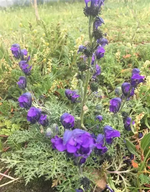 总状花序有6-16花;基部苞片似叶,其他下部苞片三裂,中部以上苞片披针形至线形;花梗长1-5(-9)厘米;小苞片生花梗上部或顶部,叶状至线形,长0.5-1.5厘米;萼片蓝紫色,少有白色,外面疏被柔毛,有较长爪,上萼片船形,高约1.8厘米,爪长约1.4厘米,侧萼片长1.5-1.8厘米,瓣片与爪近等长;花瓣的瓣片宽6-8毫米,疏被缘毛,距短,头状,疏被短毛;花丝疏被短毛;心皮6-13,子房有柔毛。蓇葖长0.8-1.2厘米;种子倒卵球形,长约1.5毫米,密生横狭翅。6-8月开花。 [1-2]