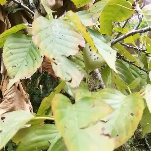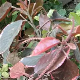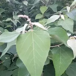 狗尾红的叶是纸质的,呈现单叶互生式,其形状主要是阔卵形的或着是卵形的,顶端部位是渐尖形的,在基部呈现阔楔形状或者是圆钝形状;在叶子上面没有毛,边缘处有粗锯齿;整体是亮绿色。