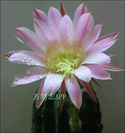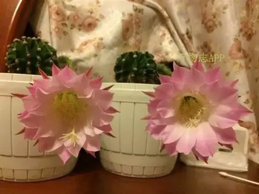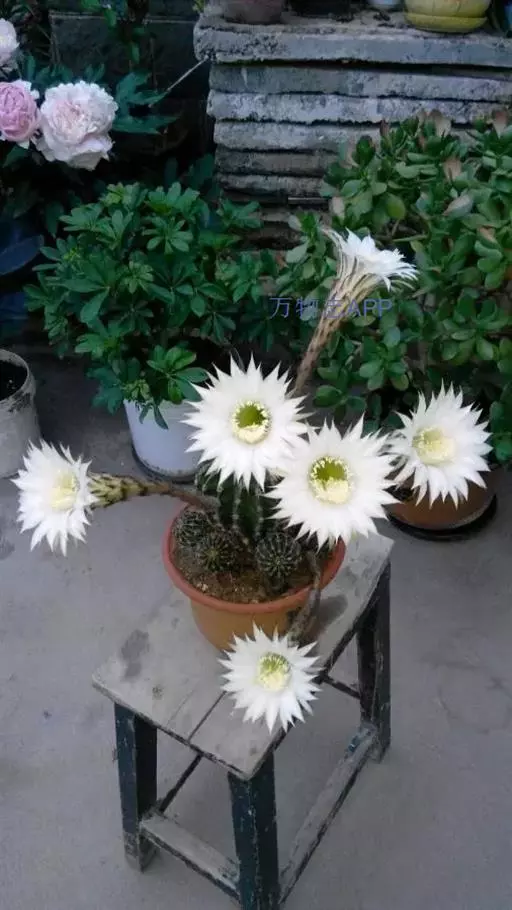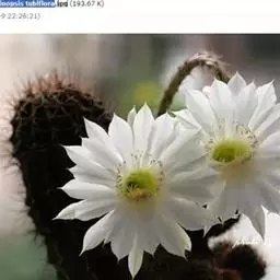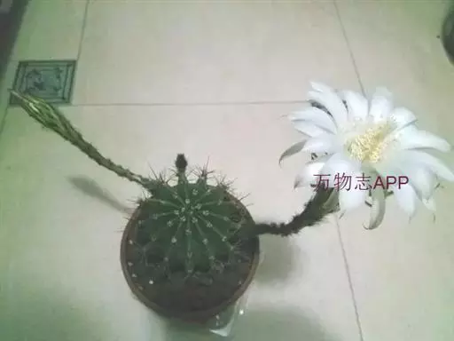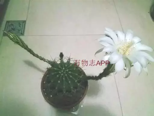 仙人球花(又名花盛球,花盛丸、草球花) 仙人掌科,仙人球属。植株单生或成丛。幼株球形,老株长成圆筒状,高可达75厘米,直径12-15厘米。球体暗绿色,具棱11-12。刺锥状,黑色,长1-1.5厘米。花着生于球体侧方,大型嗽喇叭状,白色。夏季开花。傍晚后开放,翌日清晨即凋谢。原产阿根廷北部及巴西南部的干旱草原,阳光充足,但有草丛遮荫。夏季雨水充沛而冬季干燥。植株强健,喜阳光充足,较耐寒。幼株球形,老株圆筒状,顶端凹入,高约75厘米,径12~15厘米。主球茎基盘萌发籽球。球体暗绿色,具12-14个脊高的棱,棱规则呈波状。棱上刺点单行整齐排列,刺锥状、黑色或茶色,周刺10~15,中刺2~7,稍长,新刺黑褐色,老刺黄褐色。花着生于球体侧方,大型嗽喇叭状,白色(或黄色),具香气,长约24厘米,径约l0厘米,夏季开花。傍晚后开放,翌日清晨即凋谢。一般单花开放时间36小时。是大众化的室内盆花,也是嫁接仙人掌类球形品种的良好砧木。