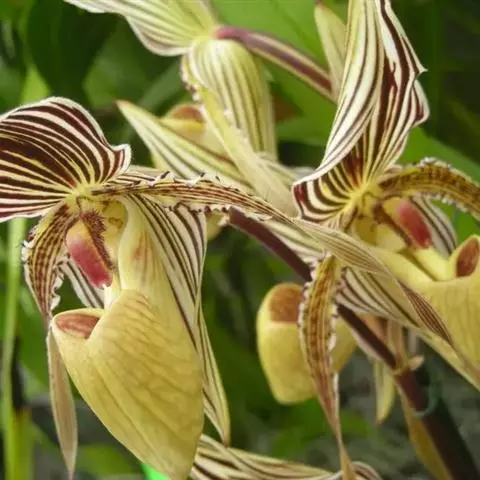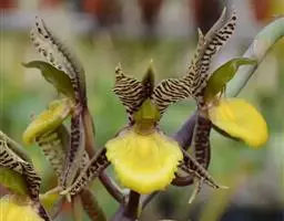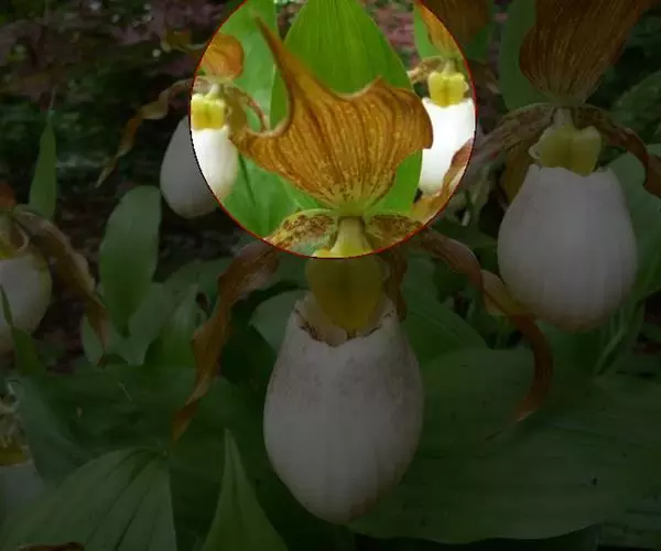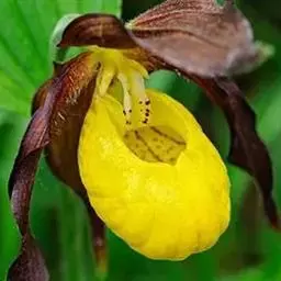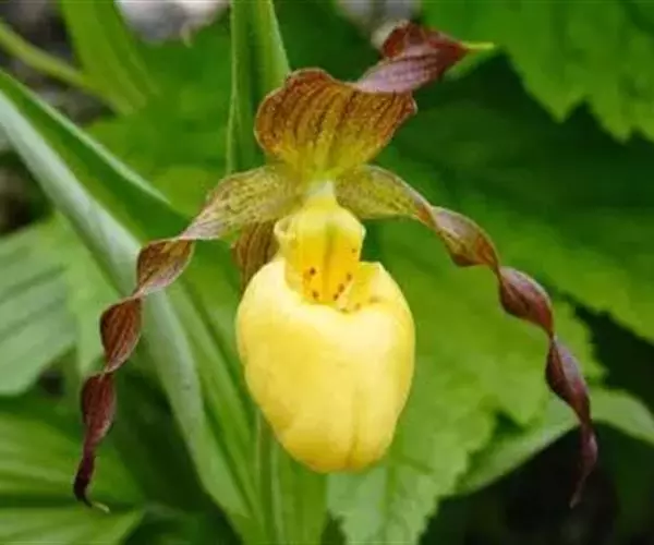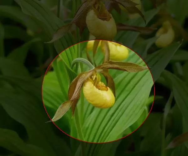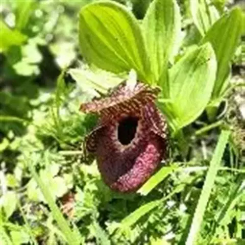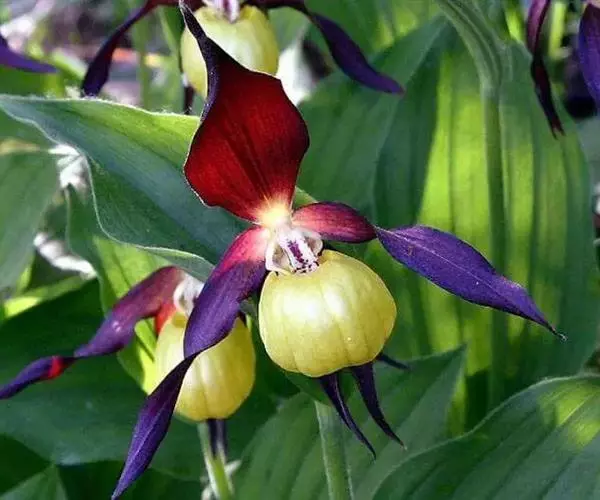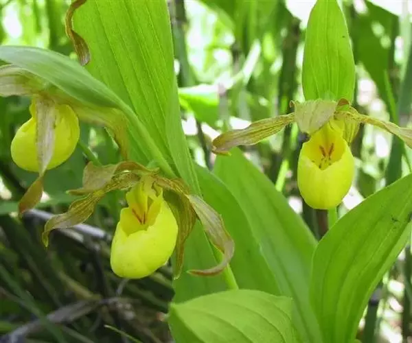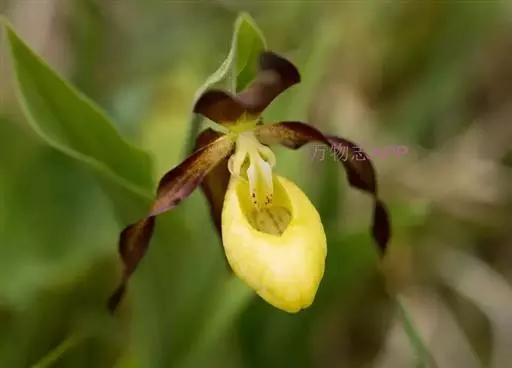 杓兰(学名:Cypripedium calceolus L.):植株高20-45厘米,具较粗壮的根状茎。茎直立,被腺毛,基部具数枚鞘,近中部以上具3-4枚叶。叶片椭圆形或卵状椭圆形,较少卵状披针形。花序顶生,通常具1-2花;花具栗色或紫红色萼片和花瓣,但唇瓣黄色;花瓣线形或线状披针形,长3-5厘米,宽4-6毫米,扭转,内表面基部与背面脉上被短柔毛;唇瓣深囊状,椭圆形。花期6-7月。