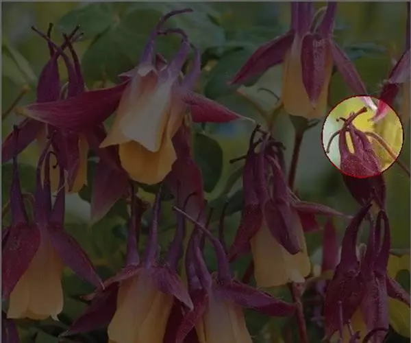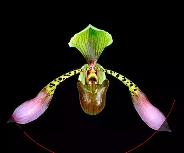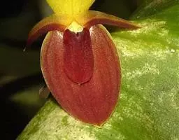 花序顶生,通常具1-2花;花苞片叶状,椭圆状披针形或卵状披针形,长4-6(-10)厘米,宽1.5-4厘米;花梗和子房长约3厘米,具短腺毛;花具栗色或紫红色萼片和花瓣,但唇瓣黄色;中萼片卵形或卵状披针形,长2.5-5厘米,宽8-15毫米,先端渐尖或尾状渐尖,背面中脉疏被短柔毛;合萼片与中萼片相似,先端2浅裂。