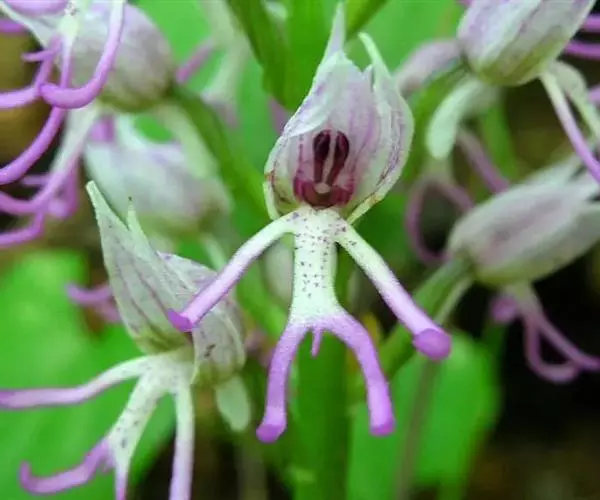 花瓣线形或线状披针形,长3-5厘米,宽4-6毫米,扭转,内表面基部与背面脉上被短柔毛;唇瓣深囊状,椭圆形,长3-4厘米,宽2-3厘米,囊底具毛,囊外无毛;内折侧裂片宽3-4毫米;退化雄蕊近长圆状椭圆形,长7-10毫米,宽5-7毫米,先端钝,基部有长约1毫米的柄,下面有龙骨状突起。花期6-7月。
