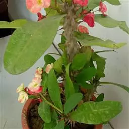 虎刺梅:别称铁海棠,是蔓生灌木植物。茎多分枝,长60-100厘米,直径5-10毫米,具纵棱,密生硬…