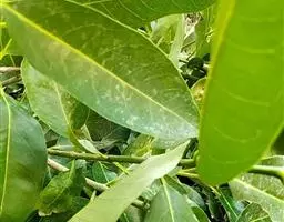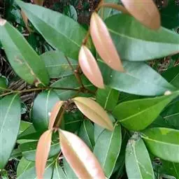 叶互生,叶片革质,披针形或狭长圆形,长4-10厘米,宽1-2厘米,两端尖,基出脉3-5(-7)条,多油腺点,香气浓郁;叶柄极短。