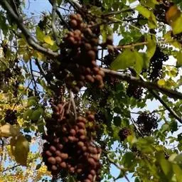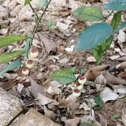 雄花:1-2朵腋生,或几朵与雌花簇生于叶腋,直径2-10毫米;花梗纤细,长5-7.5毫米;花盘浅盘状,直径5-12毫米,6浅裂,裂片倒卵形,覆瓦状排列,无退化雌蕊;雄花3,花丝合生呈短柱状,花药外向,2室,纵裂;花盘腺体6,与萼片对生,上部向内弯而将花药包围;雌花:通常单生于叶腋;花梗长6-8毫米;花萼6深裂,裂片红色,倒卵形或倒卵状三角形,长5-6毫米,宽3-5.5毫米,顶端钝或圆,基部渐狭而成短爪,覆瓦状排列;无花盘;雌蕊扁球状,直径约1.5毫米,高约0.7毫米,子房3室,每室2颗胚珠,花柱3,顶端2裂。蒴果扁球状或圆球状,直径约1.7厘米,高1.2厘米,乳白色,宿存花萼红色;果梗长5-10毫米;种子三棱状,长约7毫米,宽约5毫米,黑色。花期4-7月,果期7-12月。