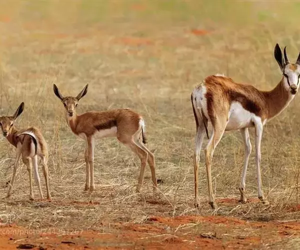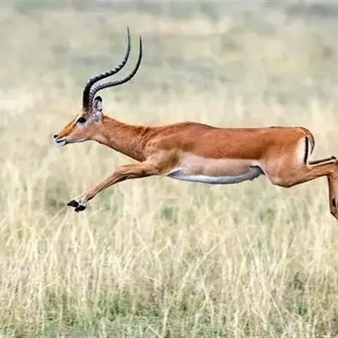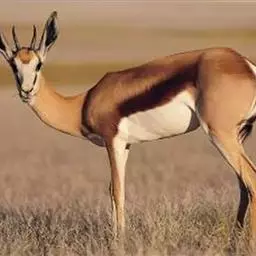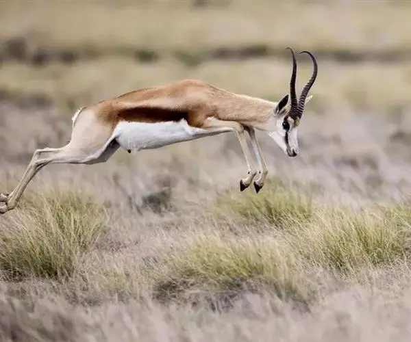 跳羚(学名:Antidorcas marsupialis):体长1.2-1.5米,肩高68-90厘米,体重37-50千克;四肢细长;背部中央有1条纵向的由皮肤下凹而形成的褶皱,褶皱内的毛为白色,当受惊而开始逃跑时,褶皱展开,出现1条明显的白脊,这是向同伴告警的信号;雌雄均具角,黑色上具环棱。极善跳跃,跳起时脊背弓起,四肢下伸而靠拢,一跃可高达3-3.5米,故名。