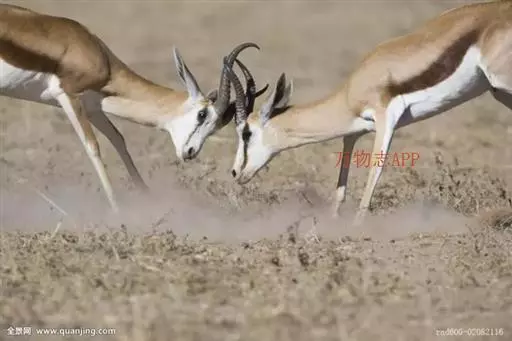 这只公羊不是“匡”的邻居,它是一个入侵者。“匡”的利益受到威胁。它聚集的母羊乃至它的生命都可能在一瞬间输给这个挑战者。一般说来,跳羚之间角斗是短暂而危险 的,没有什么仪式。它们的角也许会卡在一起,眼珠也许会被挑出,身体也许会被刺穿——这些交锋都可能致命。败阵的一方只有退入到单身公羊群中。经常性的应 战使“匡”的精力逐渐消耗,它的体重会在两星期内减轻百分之十。